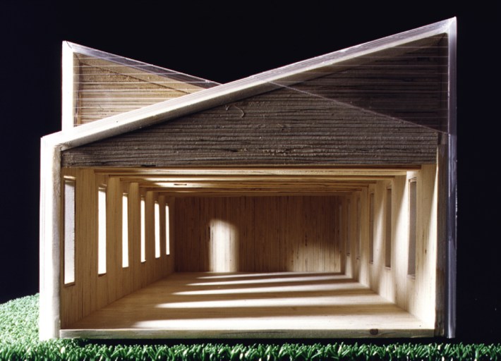 La madera laminada funciona pues como estructura, como acabado interior y como parte del aislamiento, que en este caso se amplía con una capa de policarbonato a modo de “impermeable” exterior, evitando la entrada de agua y generando una cámara ventilada entre éste y la madera que actúa como aislamiento. Desde el exterior, el aspecto sigue siendo el de una casa de madera, aunque filtrada a través de una capa a veces transparente, a veces reflectante que le añade un punto de complejidad.