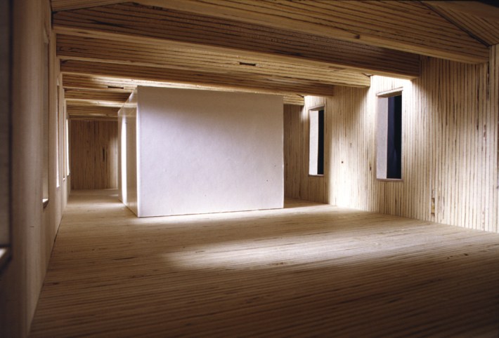 El interior, vacío y neutro, se complementa con una serie de “muebles” prefabricados a modo de armarios-pantalla que cierran algunas habitaciones y el núcleo de baños y cocina que, en su posición adecuada, separa las habitaciones del salón-comedor y el espacio de entrada.