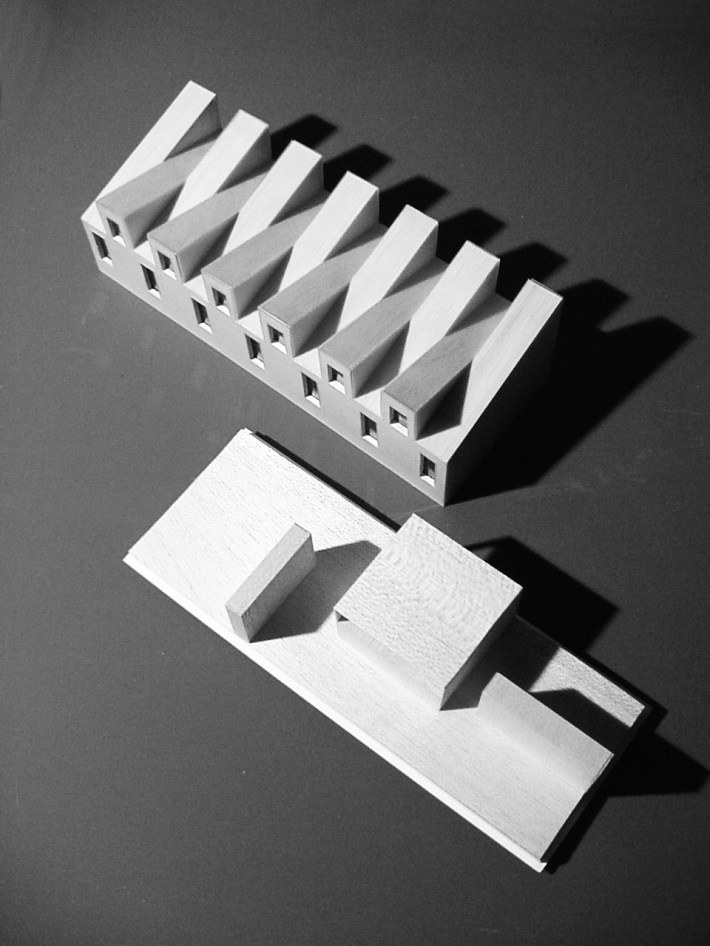 Cada módulo está formado por 6 piezas prefabricadas de madera laminada de 140 mm de grosor; dos para las fachadas, una para el suelo, una para la cubierta y dos para los laterales, éstos últimos dispuestos de manera vertical aprovechando su sección para salvar la luz transversal sin añadir material.