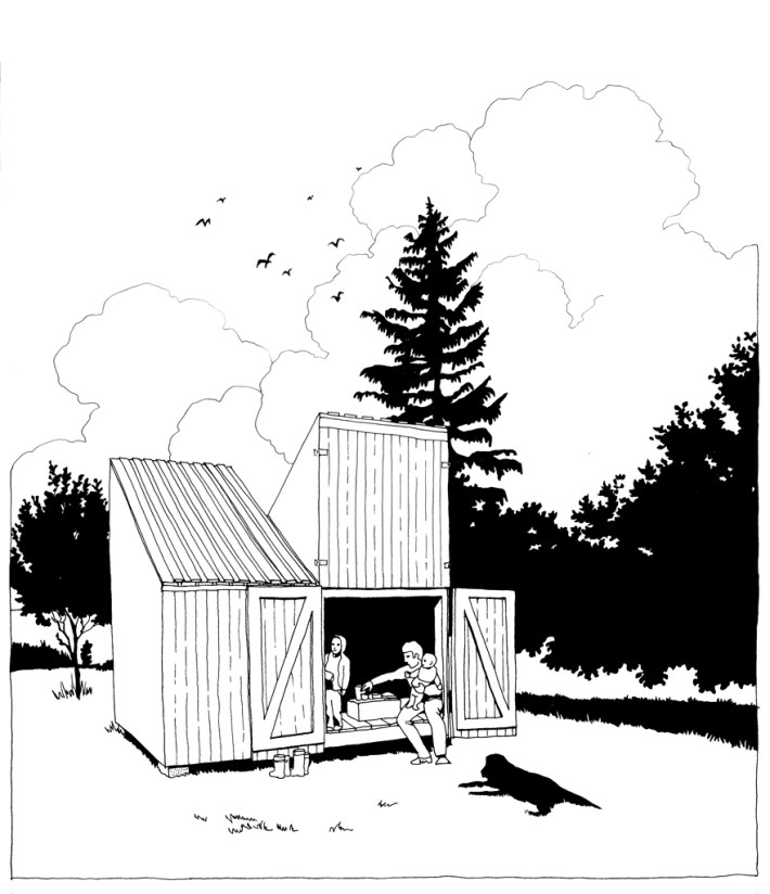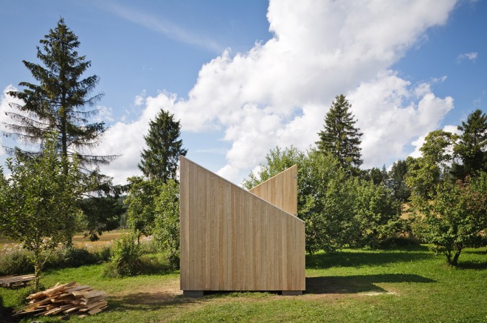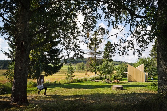 Este sencillo punto de partida permite que, desde el exterior, la casita adquiera la presencia de un elemento casi abstracto, sin referencias a la escala, mientras que en el interior, al cruzarse los dos módulos, se identifique la sección prototípica de una casa de niños, con sus dos cubiertas simétricas, como las que nosotros mismos dibujábamos de pequeños.