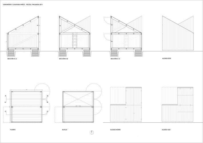 La casita se basa principalmente en una sección, que es la estructura, muy simple, que se repite en dos módulos iguales aunque orientados en direcciones opuestas. Uno de estos módulos es a doble altura (a la escala de los niños), lo que permite que un adulto pueda entrar en la casa sin tener que agacharse. El otro módulo tiene dos niveles, conectados por una sencilla escalera permitiendo un juego más complejo en el interior.