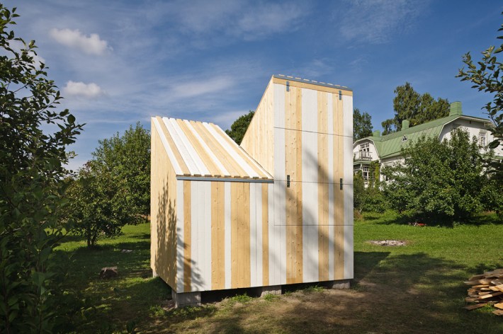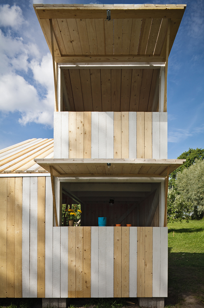 La casa se pintó con unas franjas blancas verticales, que continúan por la cubierta y ayudan a explicar la sección origen del proyecto. El resto de la madera se deja sin tratar, de manera que con el paso del tiempo ésta irá tomando un tono grisáceo que contrastará cada vez más con las partes pintadas, enseñando de una manera más obvia cómo pasa el tiempo, y con éste, cómo van creciendo los niños. Estas franjas dan un carácter festivo al volumen, asimilándolo a una casita de feria o una antigua casita para cambiarse en la playa, aunque en este caso, su emplazamiento, en un entorno totalmente rural, rodeada de manzanos, todavía le confiere un carácter más onírico.