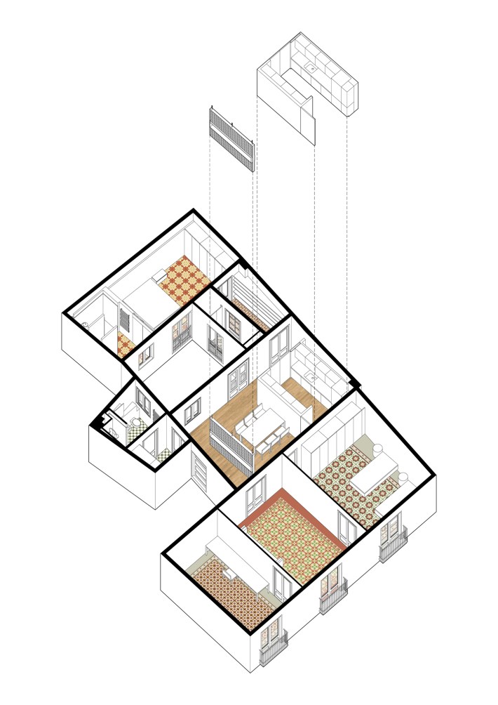 In order to improve this situation, the project opens upthe central area of the flat, making itmuch more flexible for the user´s needs, and inviting different activities. This simple changeoffers more circulation and provides for long views across the flat which enlarge its spaces.