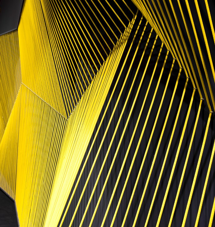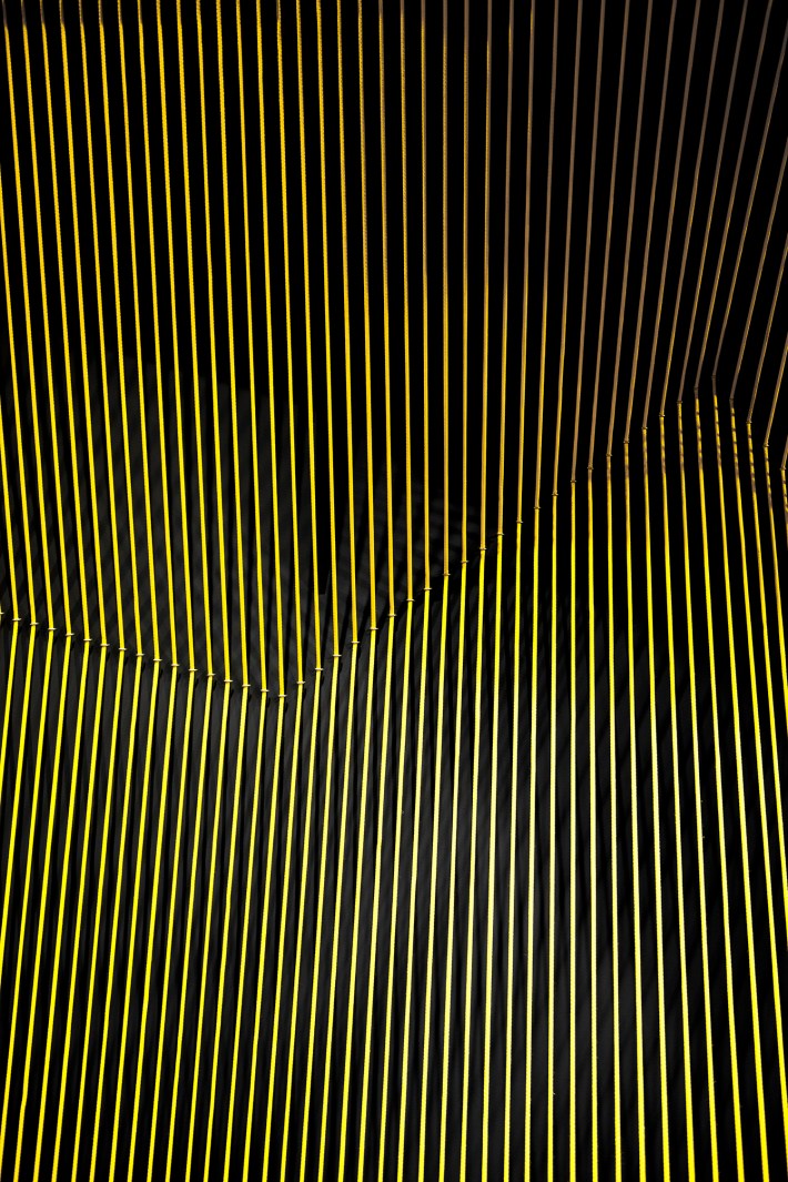 The 2016 stand was made with yellow rope on a blue background, and that of 2017 with red rope on a green background. These complementary colors add a powerful layer of complexity in their perception that adds to that produced by the different perimeter planes. The result is a powerful space which is in complete simplicity but offers a great variety of possible perceptions to the users.