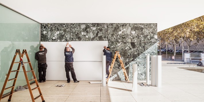 It allows us to reflect on transversal aspects like the value of imperfection, in an altered pavilion that appears neat and immaculate on the first day, but that shows all the traces of desire after days of visits. It reinforces the interpretation of the Pavilion as a temple of the German soul, now white, although still devoid of its eight columns on the access facade. We can compare it with the image of that model made of white cloth that Mies supposedly made for the Kröller-Müller family. Furthermore, it shows us the power of the boards, now perfectly visible through the disappearance of the textures and reflections that hid them and that remind us of one of the perspectives or collages so characteristic of Mies, a collage through which we now can walk.