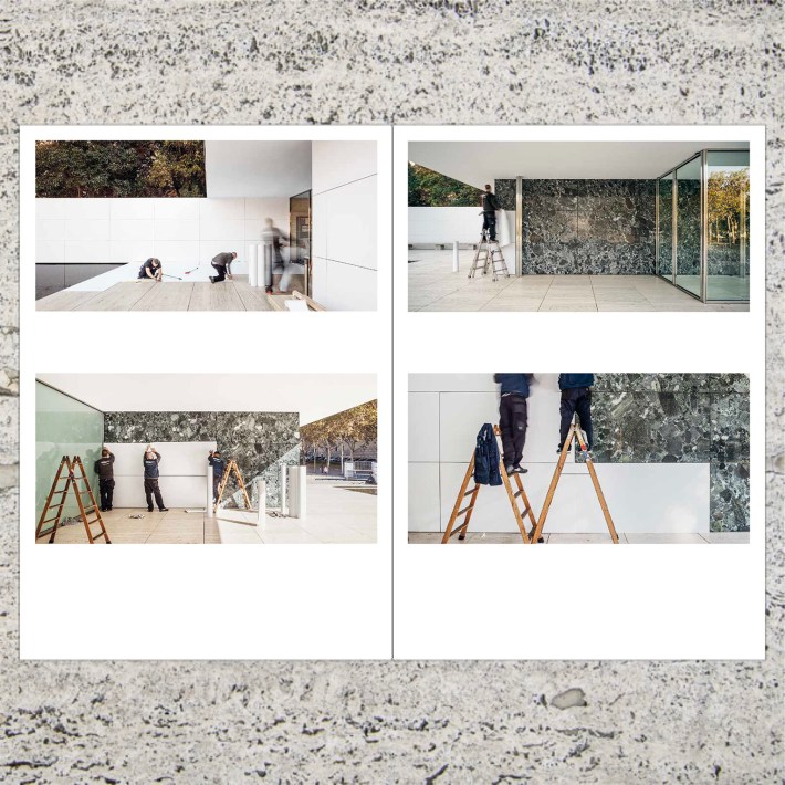 This artistic intervention has generated a book that is added to the collection of publications of the Mies van der Rohe Foundation: a beautiful edition where they are presented, in addition to texts by the authors of the intervention, the contributions of Juhani Pallasmaa, Fabrizio Gallanti, María Langarita, Carlos Quintáns and Juan José Lahuerta with images of Adrià Goula who is also the autor of a short film that includes the whole process of the intervention based on Juhani Pallasmaa’s reflections. Once the intervention was removed, the material used was reconverted into an artistic piece that is now shown and incorporated into the collection of the Mies van der Rohe Foundation.