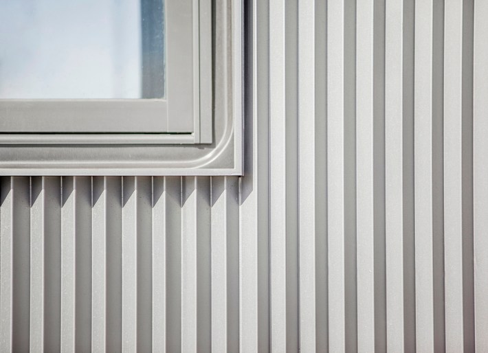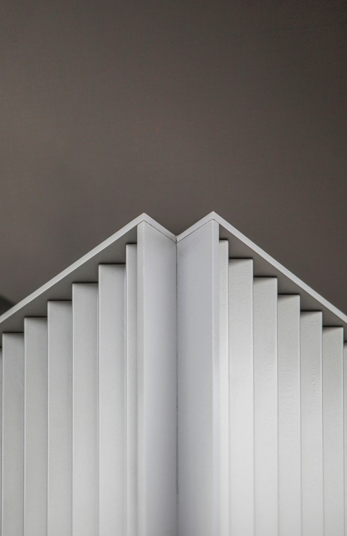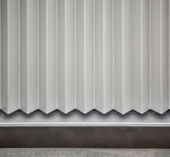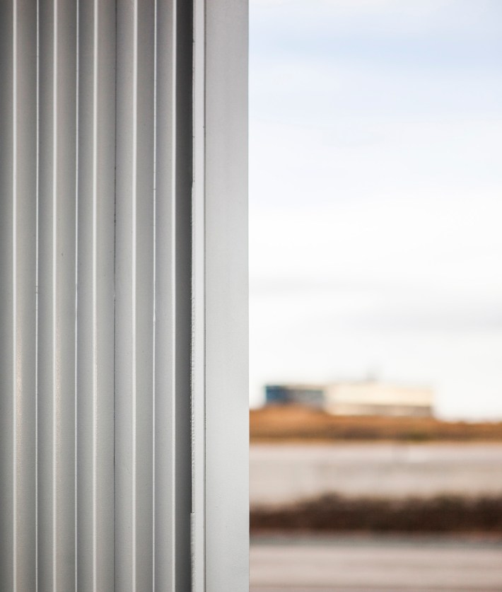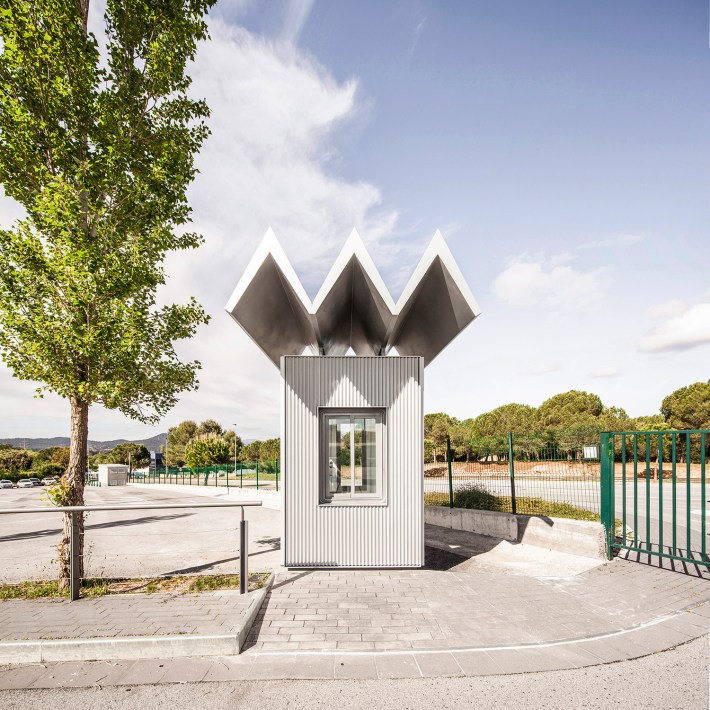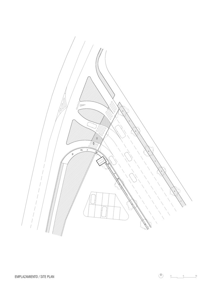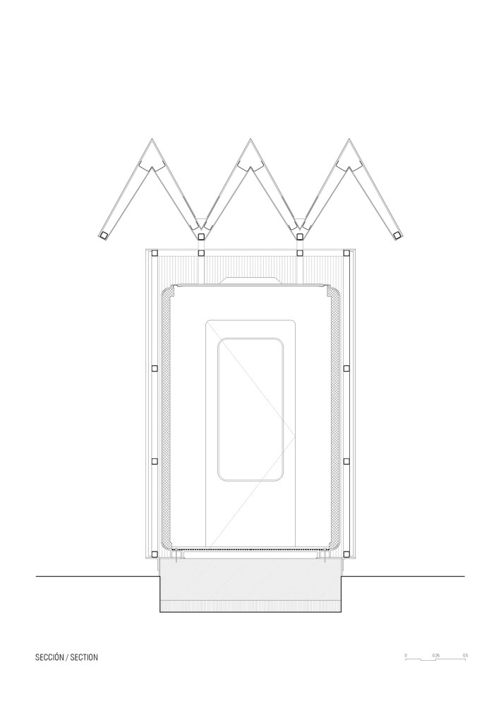 Esta lógica se traslada también al sistema de montaje, formado por un envoltorio y una tapa fabricados en taller y simplemente ensamblados en obra cubriendo un cubículo prefabricado previamente existente. La estructura ligera y el acabado de las superficies -chapa metálica plegada en zig-zag- remiten al edificio de oficinas al que se accede, aunque también nos hablan de los miriñaques, los polisones o los plisados propios del ámbito de la confección.