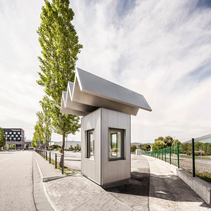 En la entrada de un complejo de oficinas era necesario ofrecer protección puntual de las inclemencias del tiempo para el guardia de seguridad que ayuda en el control de accesos. Para ello, el proyecto ofrece simplemente un abrigo y un sombrero como capas añadidas a las del vestido propio. De la misma manera que quien se quita la chaqueta y cuelga el sombrero, el proyecto intercambia el movimiento: en lugar de ser las prendas de vestir las que se separan del cuerpo, es el cuerpo el que se separa de éstas.