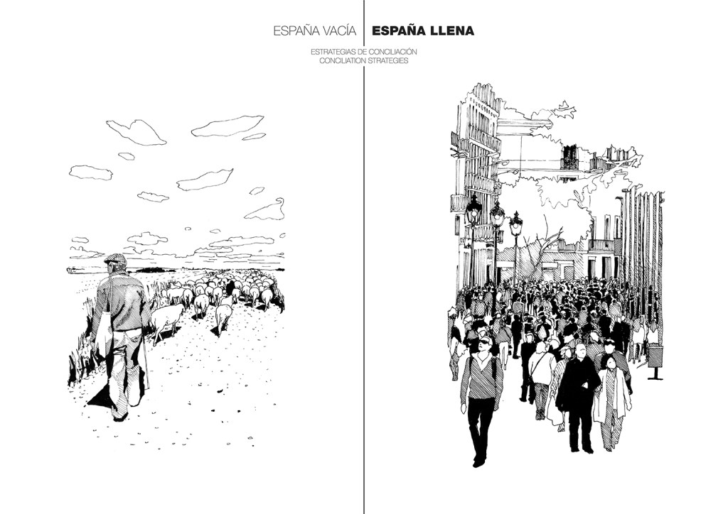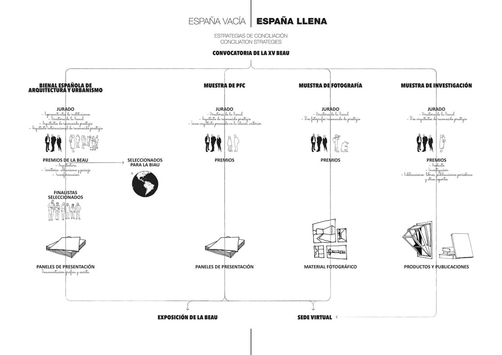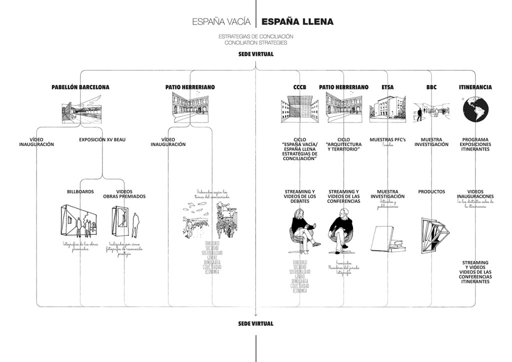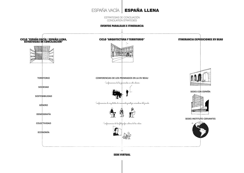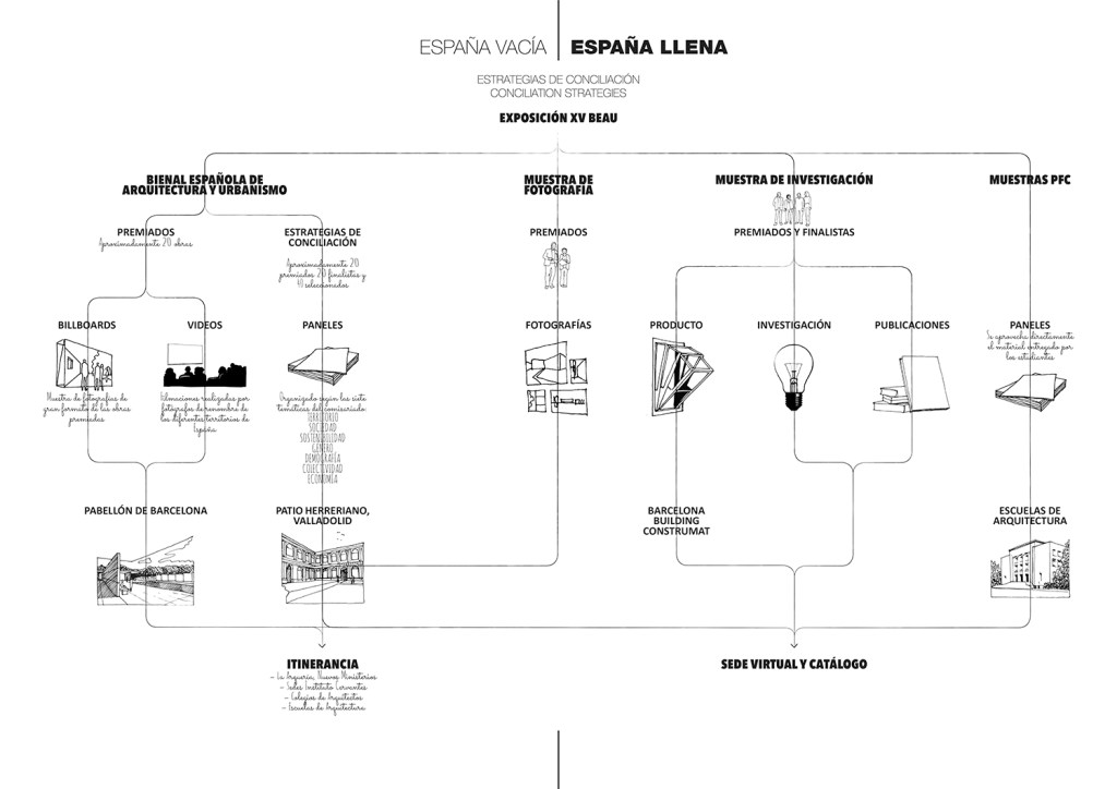 Nuestra estrategia expositiva gira en torno a siete temáticas que muestran la dicotomía y la manera como se abordan desde la arquitectura y el urbanismo ciertos conceptos en la España Vacía y la España Llena, con la voluntad de trazar similitudes y diferencias que nos permitan definir puntos de encuentro. Bajo el titulo “España Vacía / España Llena”, las temáticas de estudio en que se organizará la XV Bienal son: