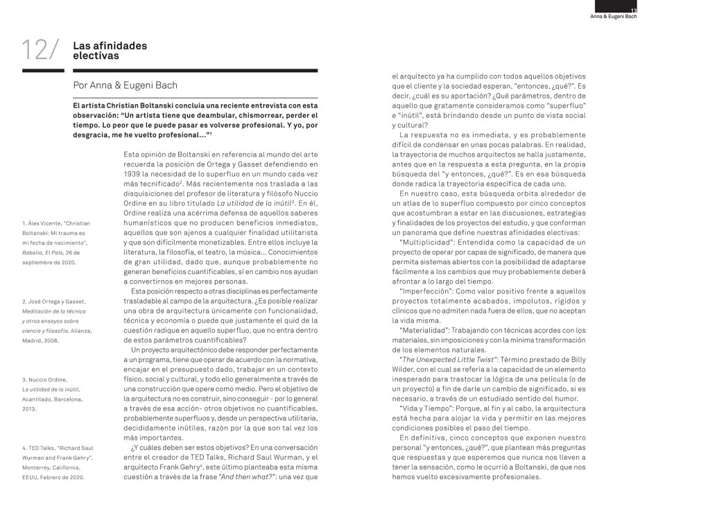 ANNA & EUGENI BACH is the team formed by Anna Bach (Nummi-Pusula, Finland, 1973) and Eugeni Bach (Barcelona, 1974). With a broad vision of the field of architecture, their interests cover four main activities: professional practice, through both public and private projects carried out at Anna & Eugeni Bach / Bach arquitectes; teaching, as professors at ETSAB UPC, ETSALS URL, EINA UAB, and through lectures and workshops at various European universities; research, as doctoral candidates at the university and through projects and installations that explore spatial perception; and, finally, cultural activity, as directors of the XV Spanish Biennial of Architecture and Urbanism, as well as curators of various exhibitions and lecture series.
