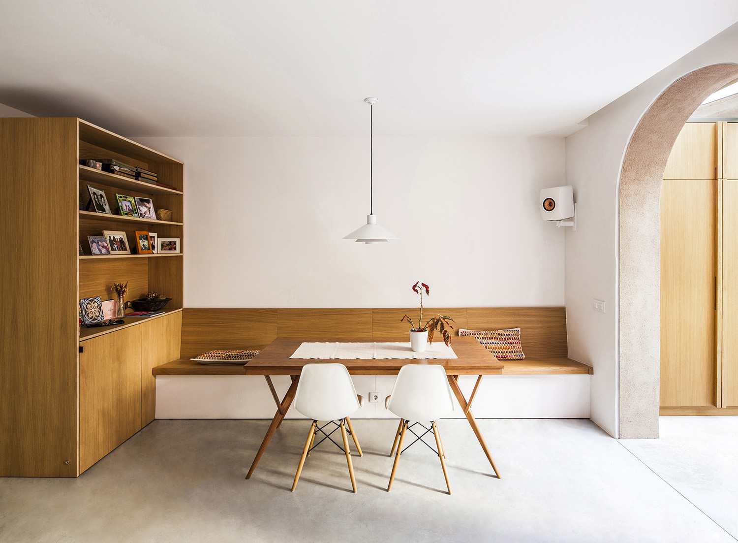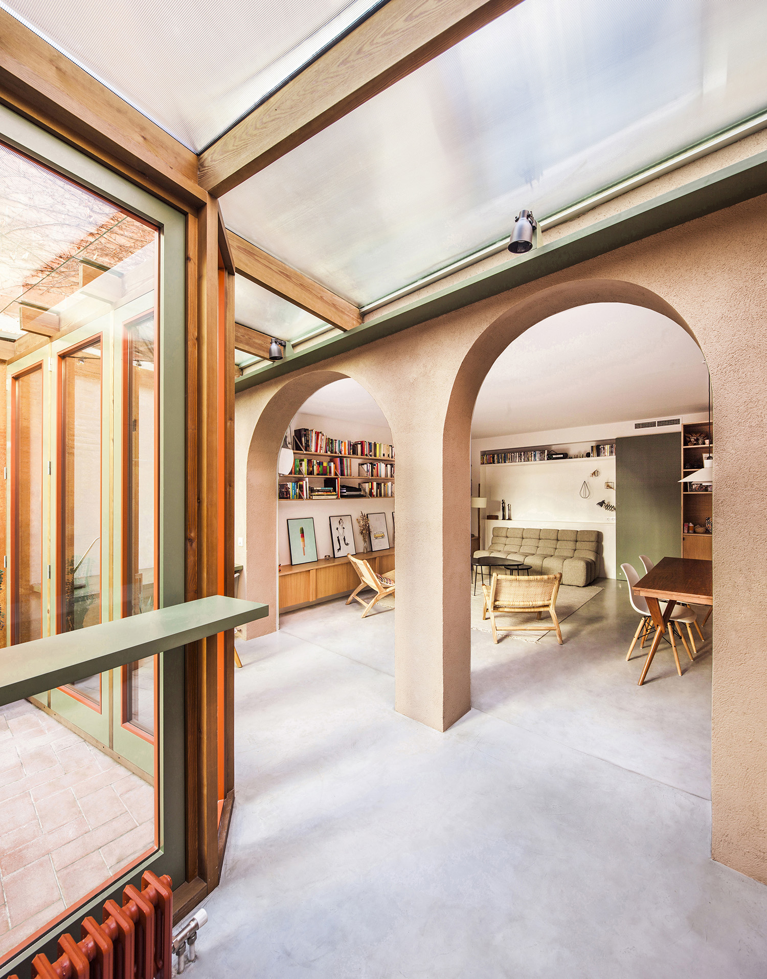 The new façade of the extension is detached from the vertical line of the property, freeing the two arches that originally enclosed the interior space and that now act as a transit between the living-dining room and the new gallery with the kitchen and study. By separating the façade, the new envelope is freed from the guidelines of the existing building, making small inflections that allow more space in the areas of more activity, both inside and in the patio.