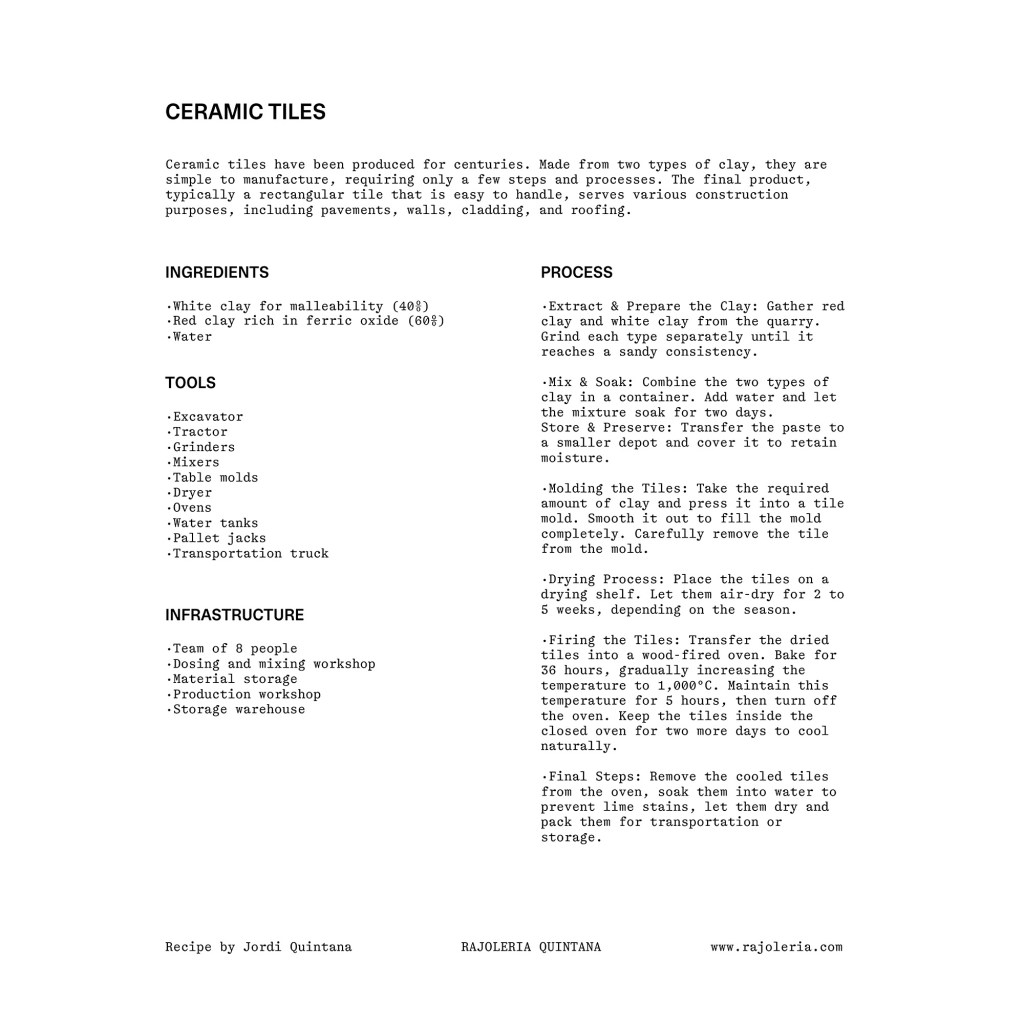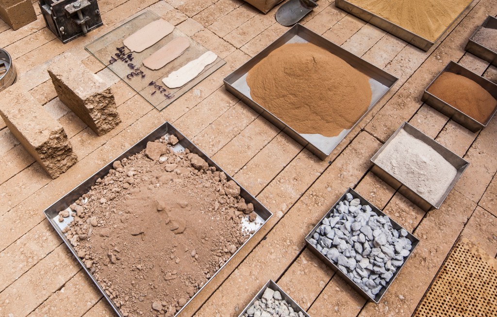 La sala LABOR presenta una muestra de los procesos de producción y elementos de construcción realizados en tierra por tres empresas catalanas que trabajan intentando minimizar las externalidades: Cerámica Cumella (gres cocido / innovación en los procesos), Fetdeterra (tierra compactada / innovación industrial y circularidad) y Rajoleria Quintana (arcilla cocida / recuperación de procesos tradicionales).