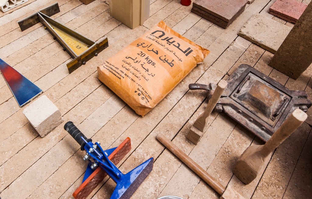 Aligned with this vision, the central piece of the room consists of 200 compacted earth blocks from Fetdeterra, simply stacked, serving as a display platform for the tools processes, and products used daily by these three companies. Once the exhibition is finished, both the blocks and the tools will return to their workshops to continue being used.