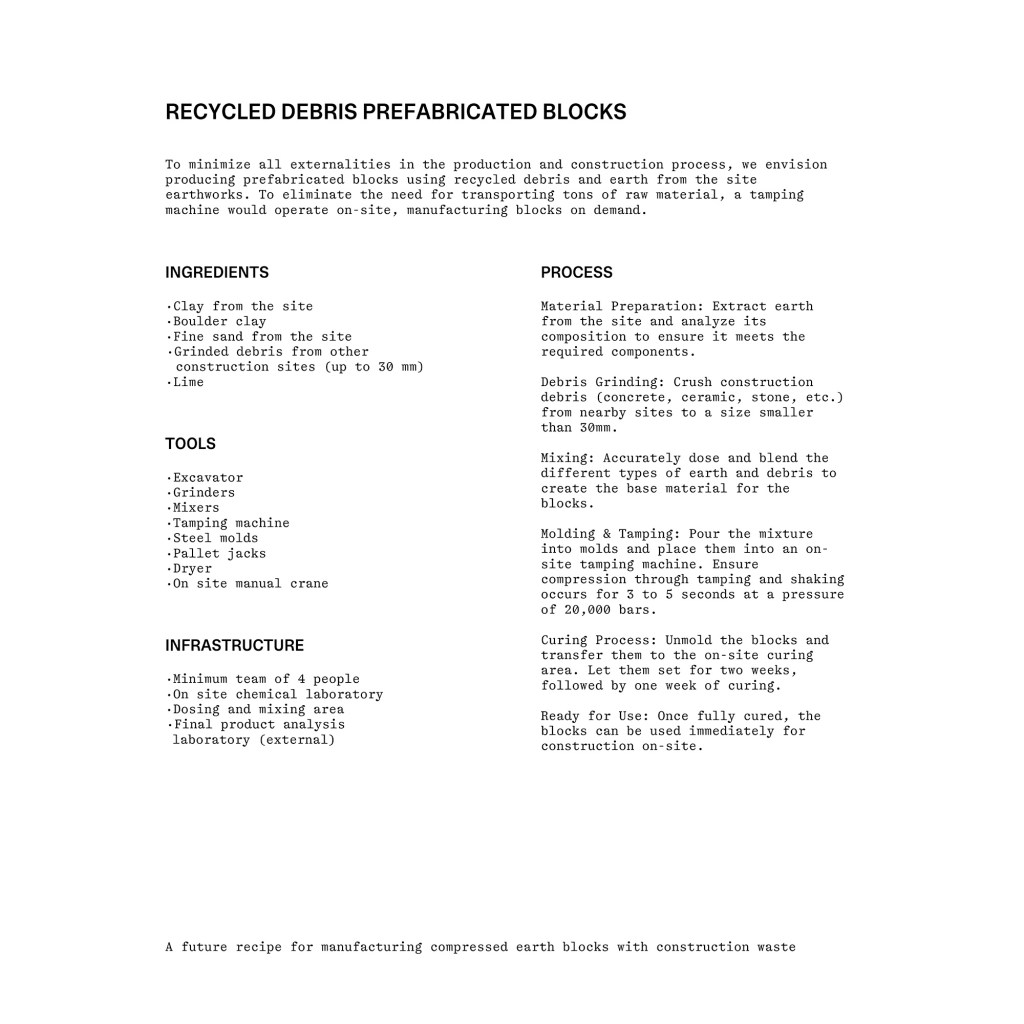 Acorde con esta visión, la pieza central de la sala está compuesta por 200 bloques de tierra compactada de Fetdeterra, simplemente apoyados, sobre los cuales se extiende una muestra de las herramientas, procesos y productos habituales en el día a día de estas tres empresas. Una vez finalizada la exposición, tanto los bloques como las herramientas volverán a sus talleres para seguir siendo utilizados.