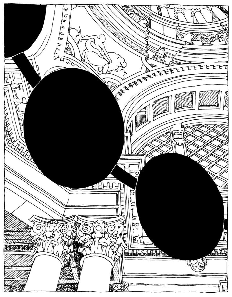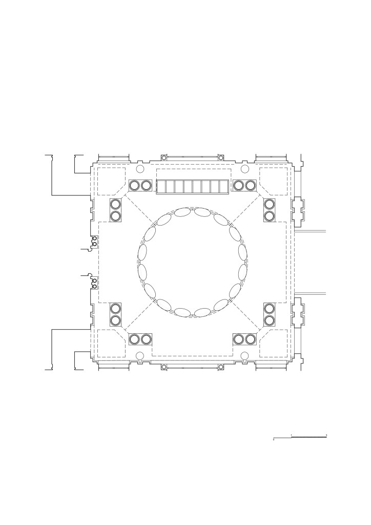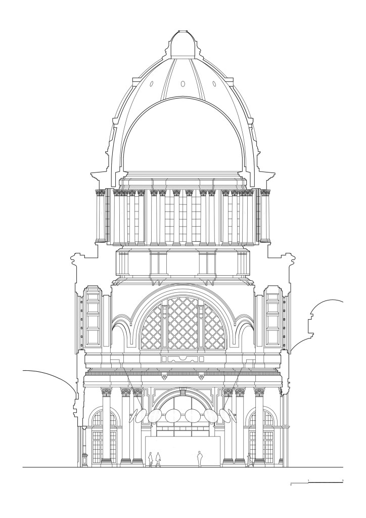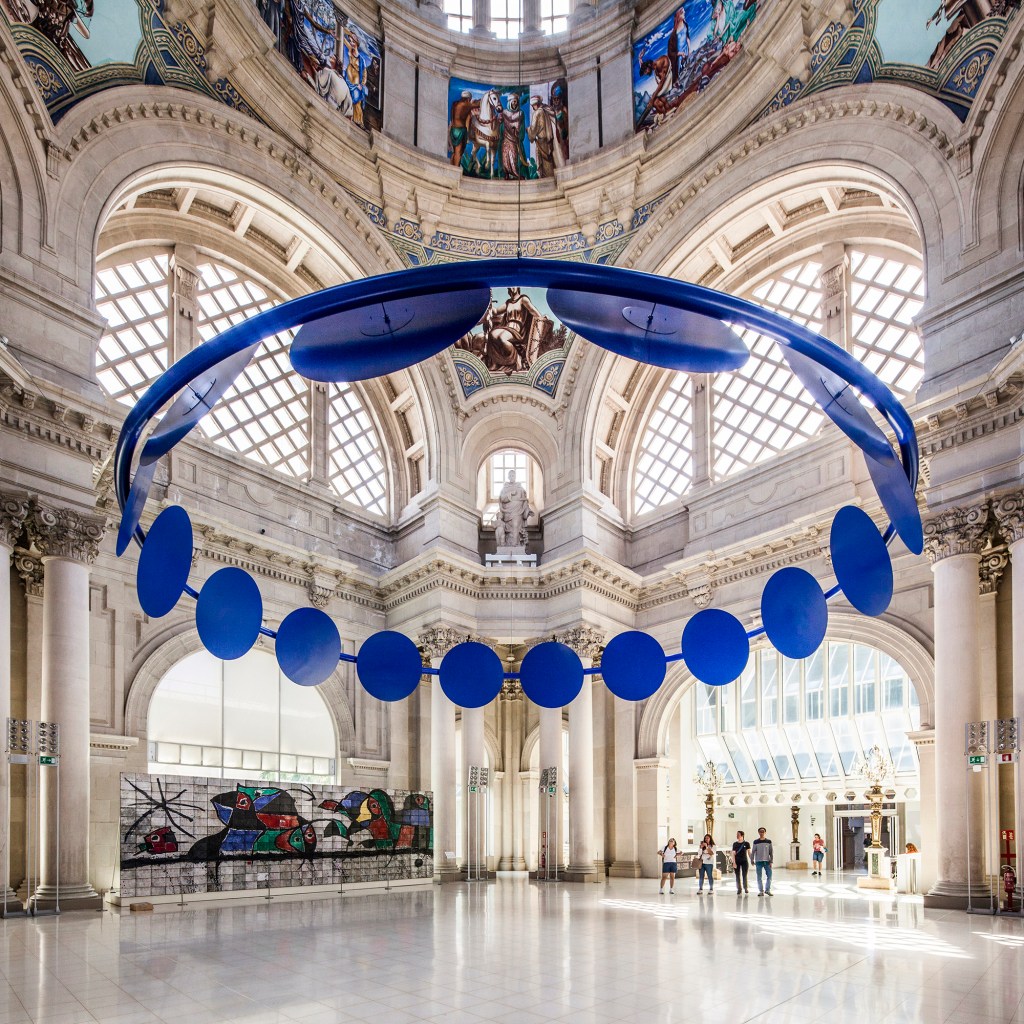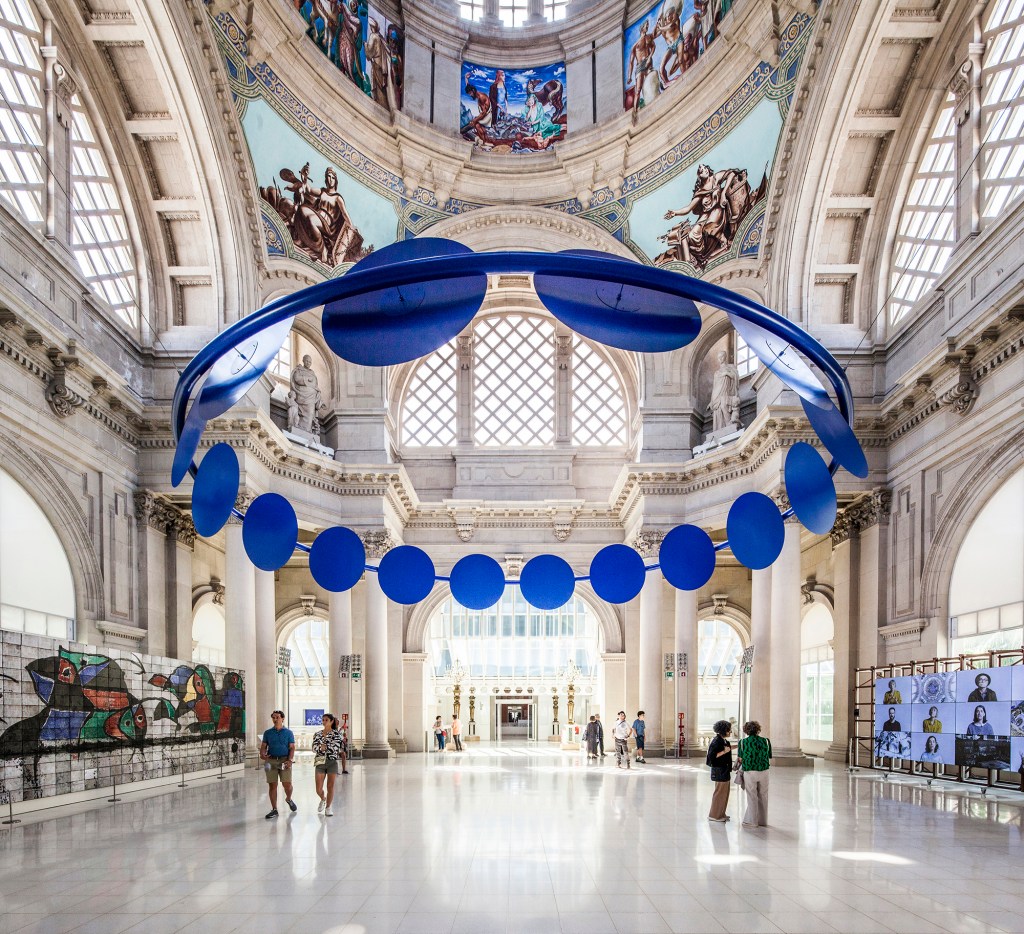 The crown consists of a twelve-meter diameter ring containing sixteen medallions, referencing both Galí’s “eyes” and the sixteen columns of the hall that support the dome. The crown floats six meters high, fragilely, just like Galí’s scaffold during the half-year he spent painting the murals. The entire structure is rendered in a deep blue, echoing the sky of the dome at its highest point.